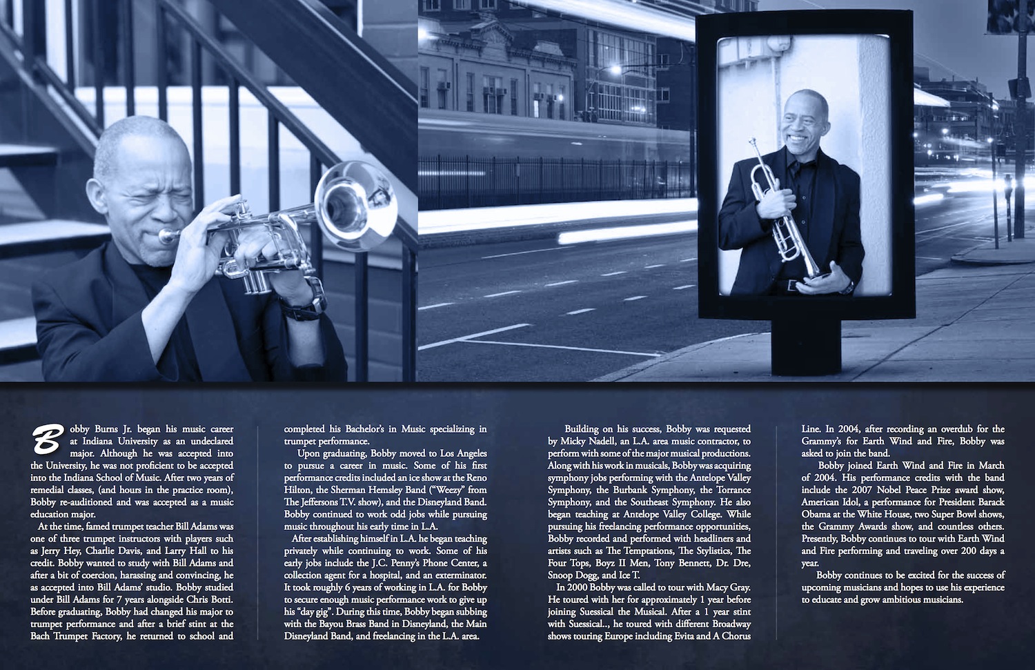 We are excited to announce Bobby Burns Jr., trumpet player with the legendary, Grammy Award winning band, Earth Wind and Fire, will be our first Meet the Artists Series guest presenter on MONDAY, June 2, 2014 from 7:00-8:00pm.