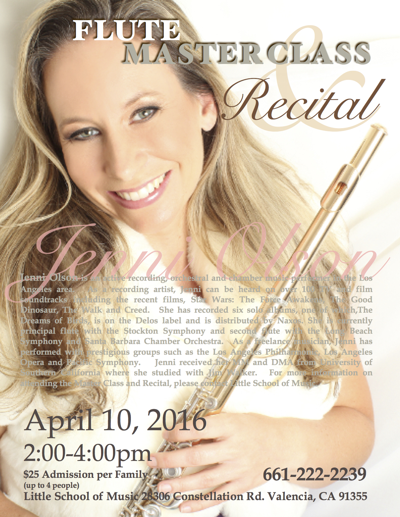 Jenni Olson is an active recording, orchestral and chamber music performer in the Los Angeles area. As a recording artist, Jenni can be heard on over 100 TV and film soundtracks including the recent films, Star Wars: The Force Awakens, The Good Dinosaur, The Walk and Creed. She has recorded six solo albums, one of which,The Dreams of Birds, is on the Delos label and is distributed by Naxos. She is currently principal flute with the Stockton Symphony and second flute with the Long Beach Symphony and Santa Barbara Chamber Orchestra. As a freelance musician, Jenni has performed with prestigious groups such as the Los Angeles Philharmonic, Los Angeles Opera and Pacific Symphony. Jenni received her MM and DMA from University of Southern California where she studied with Jim Walker. For more information on attending the Master Class and Recital, please contact Little School of Music: 661-222-2239