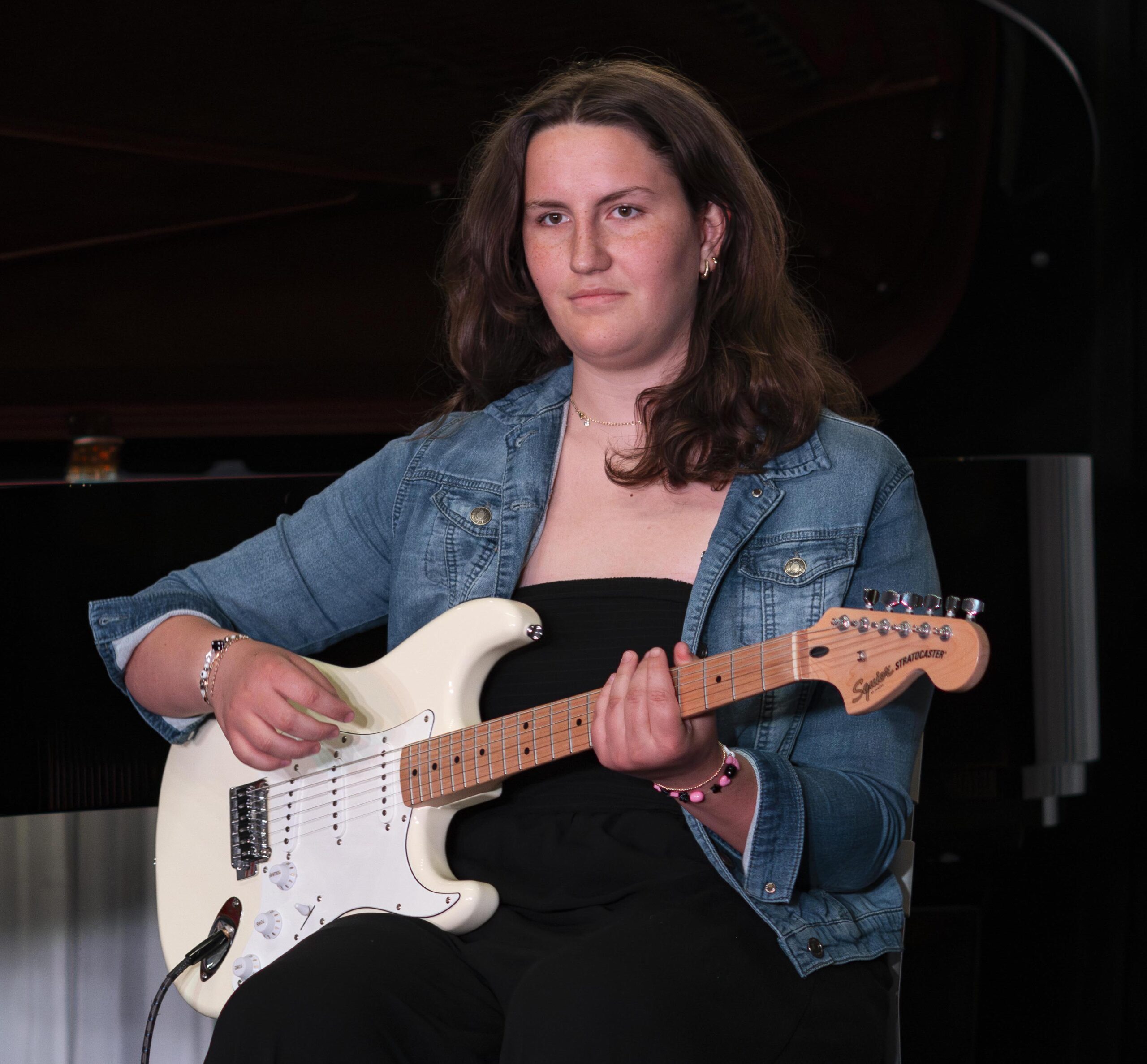 Over the last four years, she has studied both acoustic and electric guitar, completed Rock School Grade 2, and worked through Berklee’s Modern Method for Guitar. Under the guidance of teacher Frank Browne, she developed a deep understanding of jazz rhythm, scales, arpeggios, blues soloing, and improvisation—often applying these concepts to both guitar and piano.