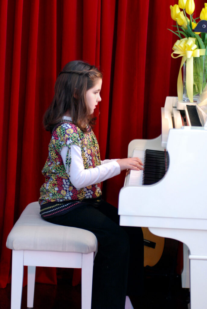Nicole: After the Music for Little Mozarts Program, we began taking semi-private lessons with Miss Mindy, working within the Alfred level system. I loved the big white piano we played on. We also attended a group music theory class where we studied why we were playing the notes we were playing. Eventually, we switched to fully private classes with Miss Jean, studying more difficult music within the Music Teachers’ Association of California (MTAC) and The Royal Conservatory of Music Certificate Program (RCM) assessment programs.